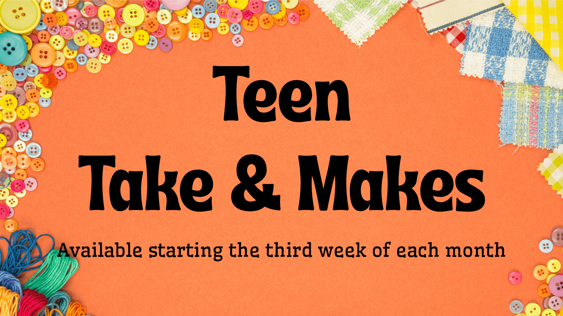Stop by the library each month to grab a fun Take & Make kit just for teens! We’ll be offering creative projects including Zentangle Journals, Friendship Bracelets, and Pencil Holders. Kits are available all week. Perfect to take home and create on your own time.