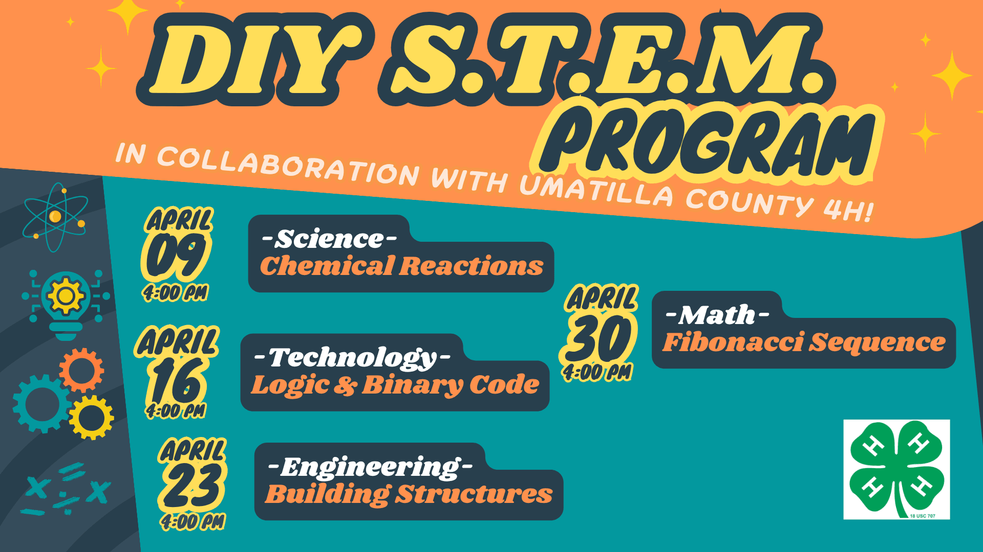 Join us for an exciting DIY STEM series in collaboration with Umatilla County 4-H! Each week, kids will explore a new hands-on activity. From chemical reactions and coding to engineering challenges and math in nature. Create, experiment, and discover something new every week!