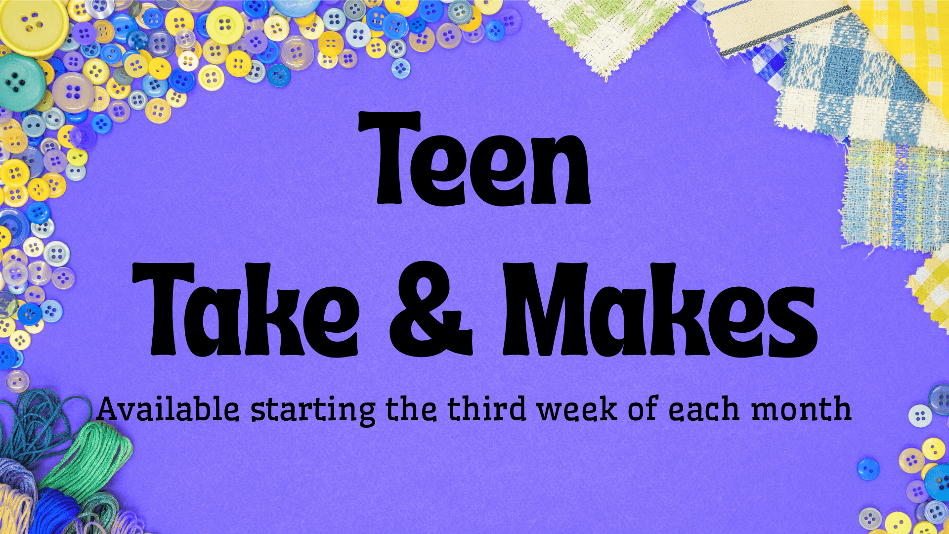 Stop by the library each month to grab a fun Take & Make kit just for teens! We’ll be offering creative projects including Beaded Bookmarks and Mug Rugs. Kits are available all week. Perfect to take home and create on your own time.